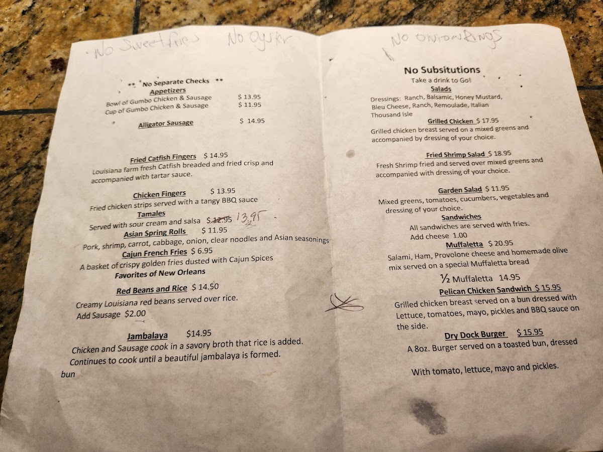Entrees offer a range of seafood and traditional New Orleans dishes, including Red Beans and Rice, Hamburger Steak with mashed potatoes and garlic bread, Crawfish Maureenica with pasta and parmesan cheese, and Shrimp Scampi featuring Gulf Shrimp sautéed with complementary flavors. The menu also highlights local specialties such as alligator sausage, various Po’ Boy sandwiches (including Shrimp, Roast Beef, Ham and Cheese, and Cajun Roast Beef), Gumbo, Shrimp Bisque, and burger options.