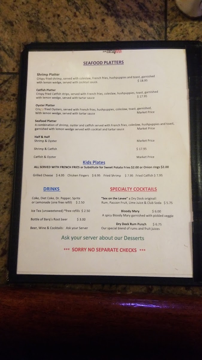The menu at Dry Dock Café features a variety of food and drink options typical of a bar & grill and restaurant setting. It is structured into distinct groups including appetizers, entrees, and beverages, providing choices suitable for casual dining occasions.