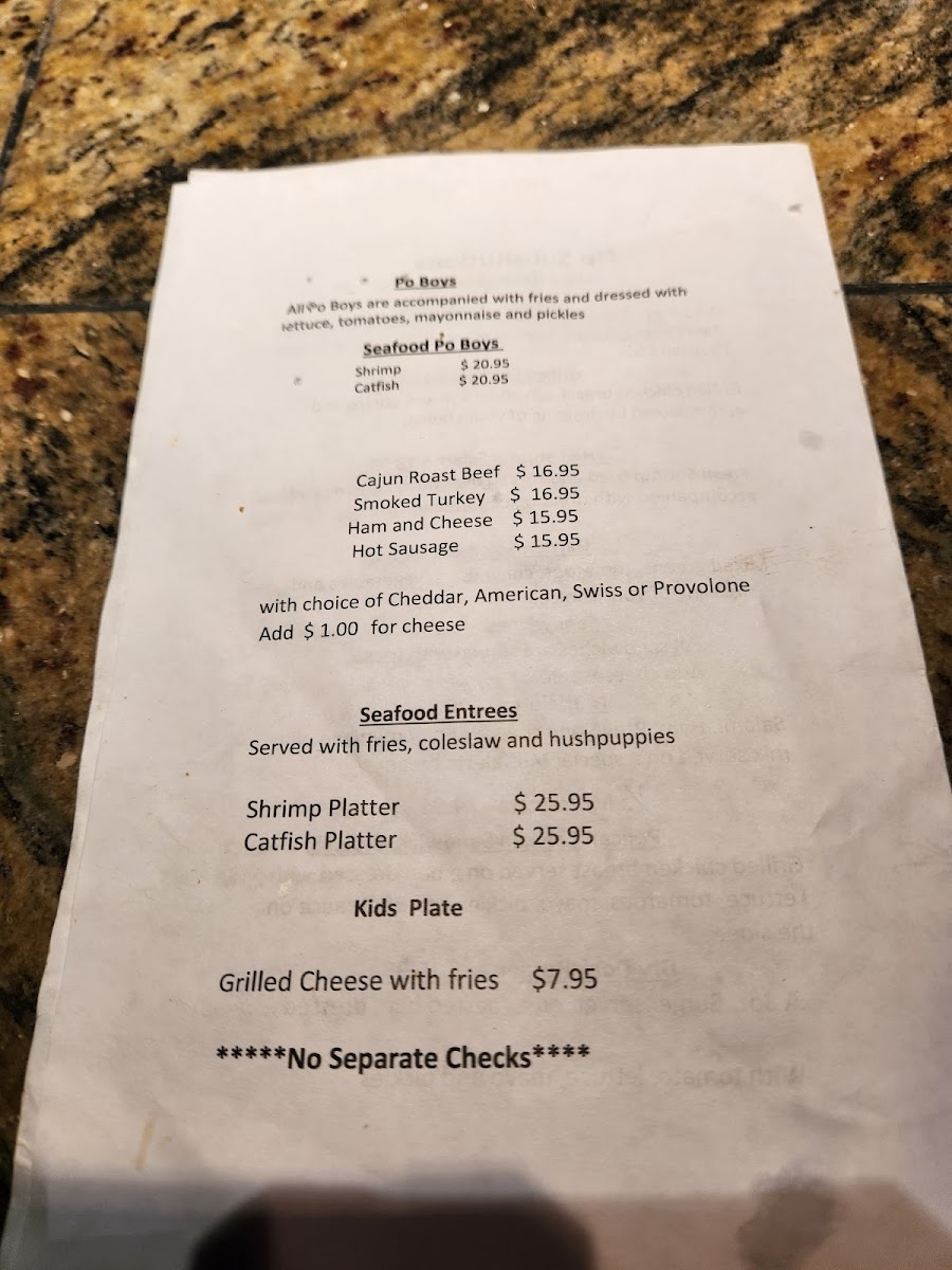 The menu caters to those seeking quick orders or casual meals, offering a balance of seafood, traditional southern dishes, sandwiches, and beverages suitable throughout the day for lunch, dinner, or light snacks.